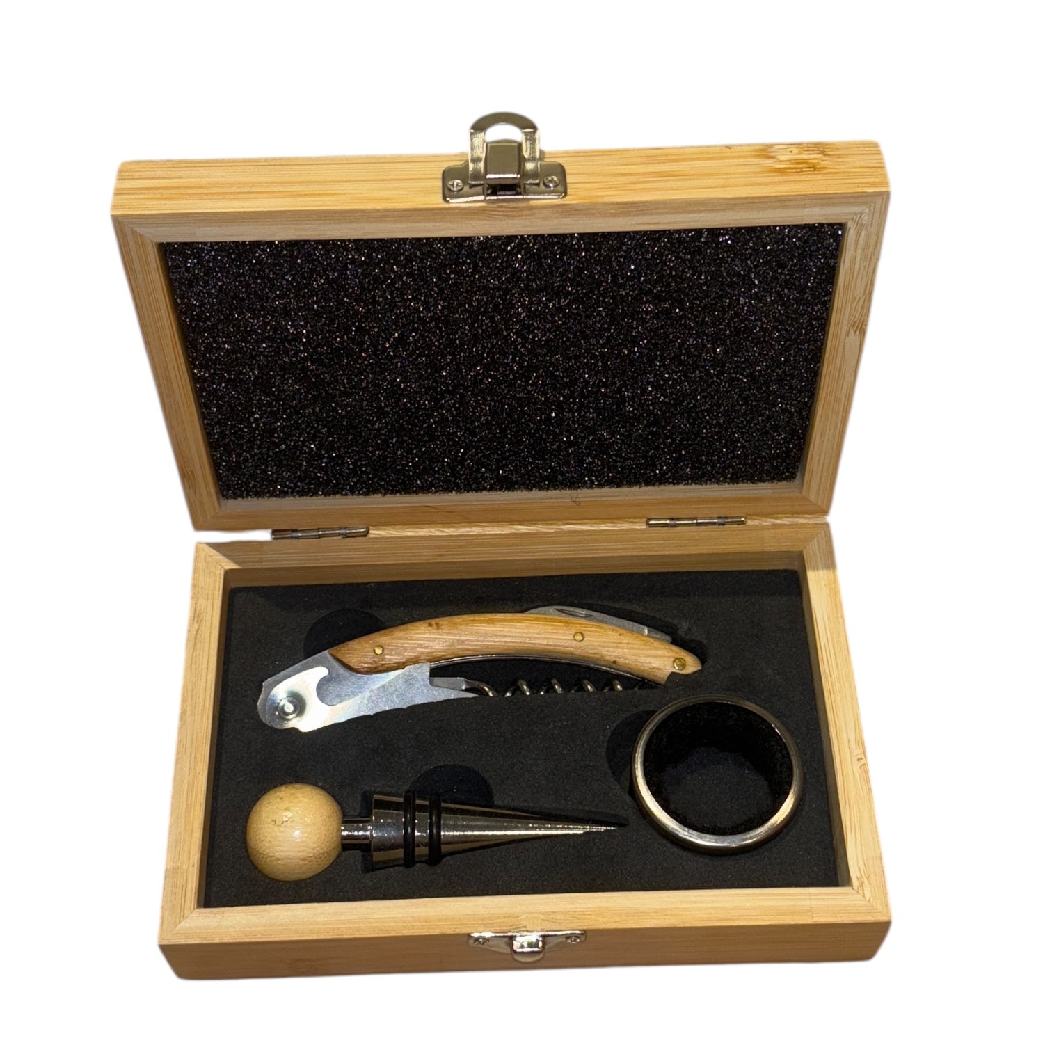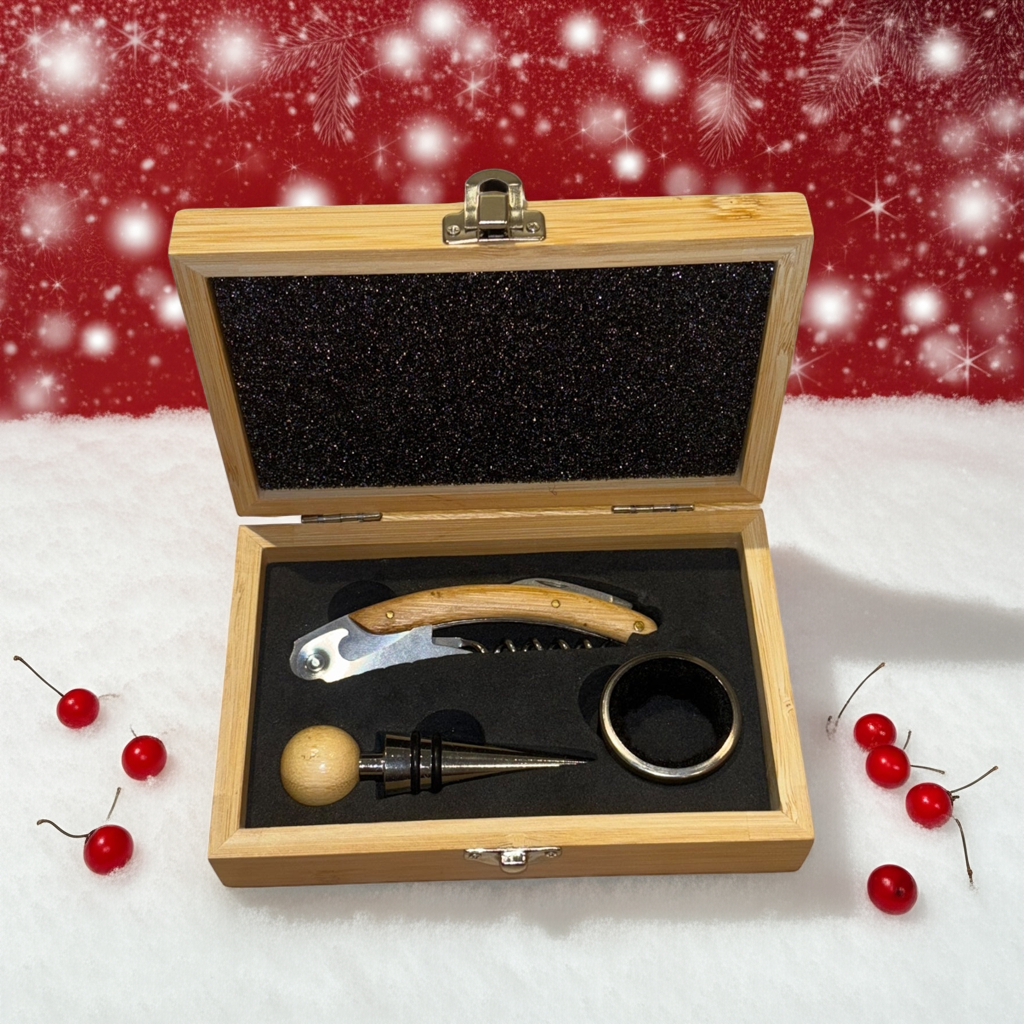 Cheers to the perfect gift! This bamboo wine accessory set includes three essentials: a stainless steel corkscrew with wood handle, a wine stopper, and a drip ring—all packaged in a sleek natural bamboo box.