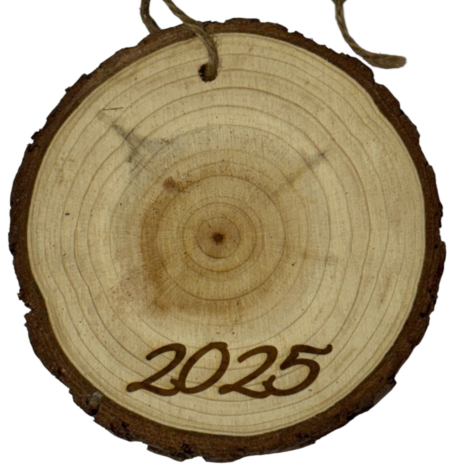Each ornament is crafted from a natural 3–4” live edge wood slice, with rustic twine for hanging. The back includes the year engraving and space for multi-word personalization — add a name, date, or special phrase to create a one-of-a-kind keepsake.