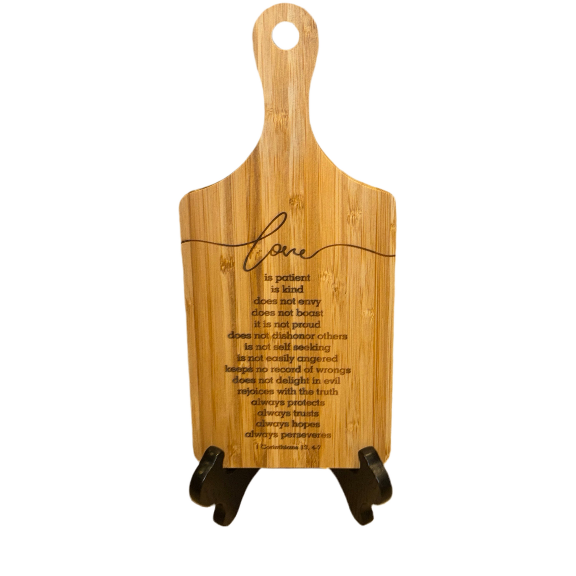 Engraved Bamboo Scripture Board – 1 Corinthians 13:4–7 | “Love Is Patient” Mini Cutting Board