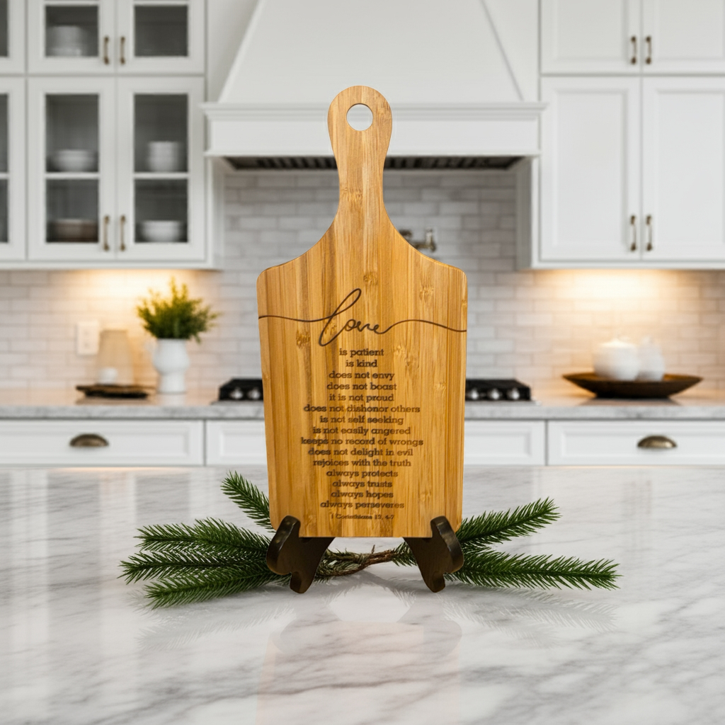 This engraved bamboo cutting board is a heartfelt reminder of what love truly means. Featuring the timeless passage from 1 Corinthians 13:4–7, this elegant board reads: