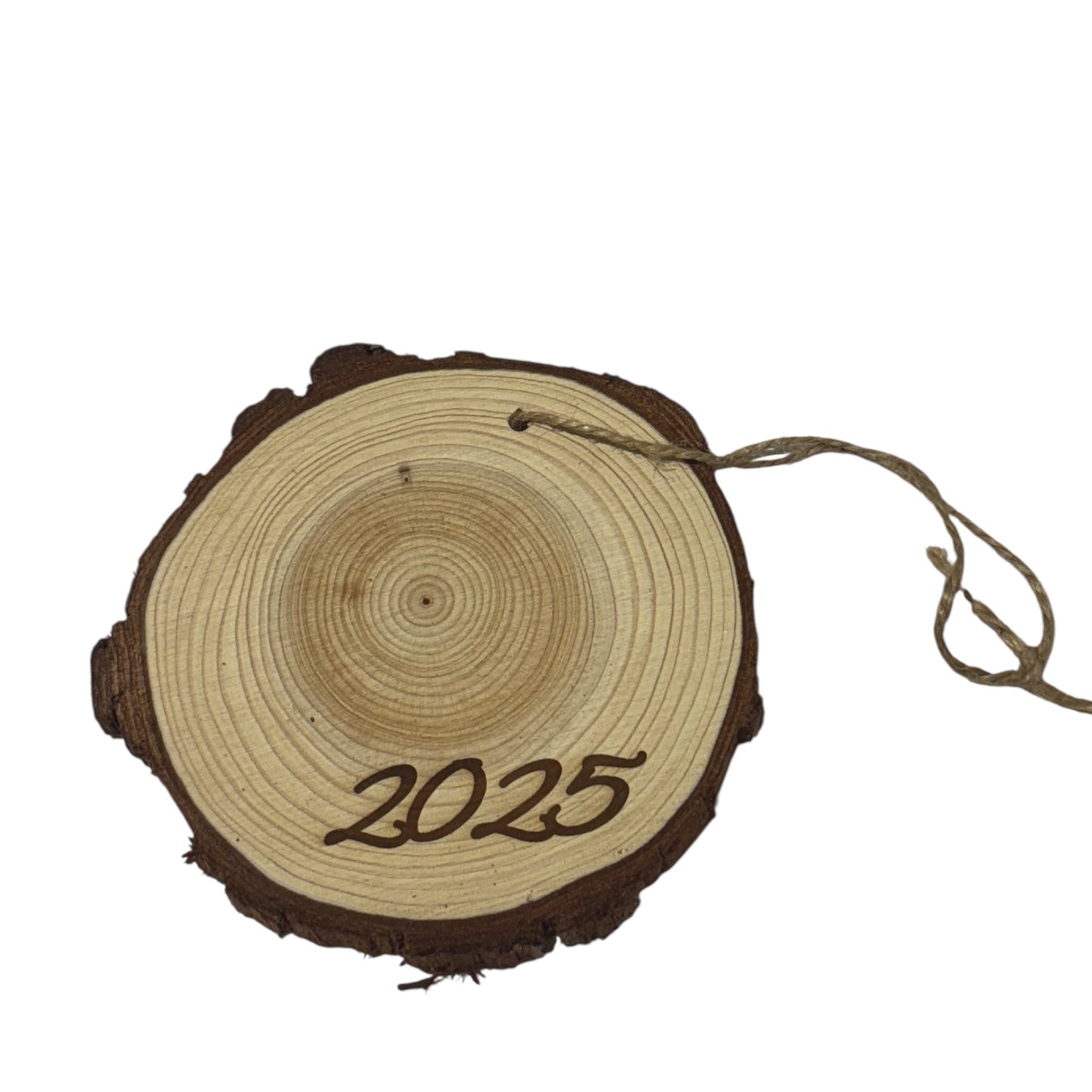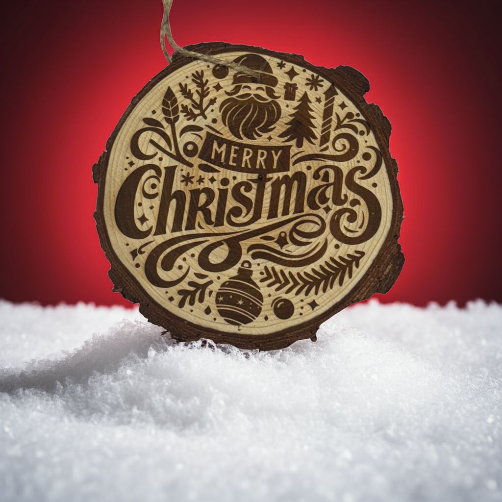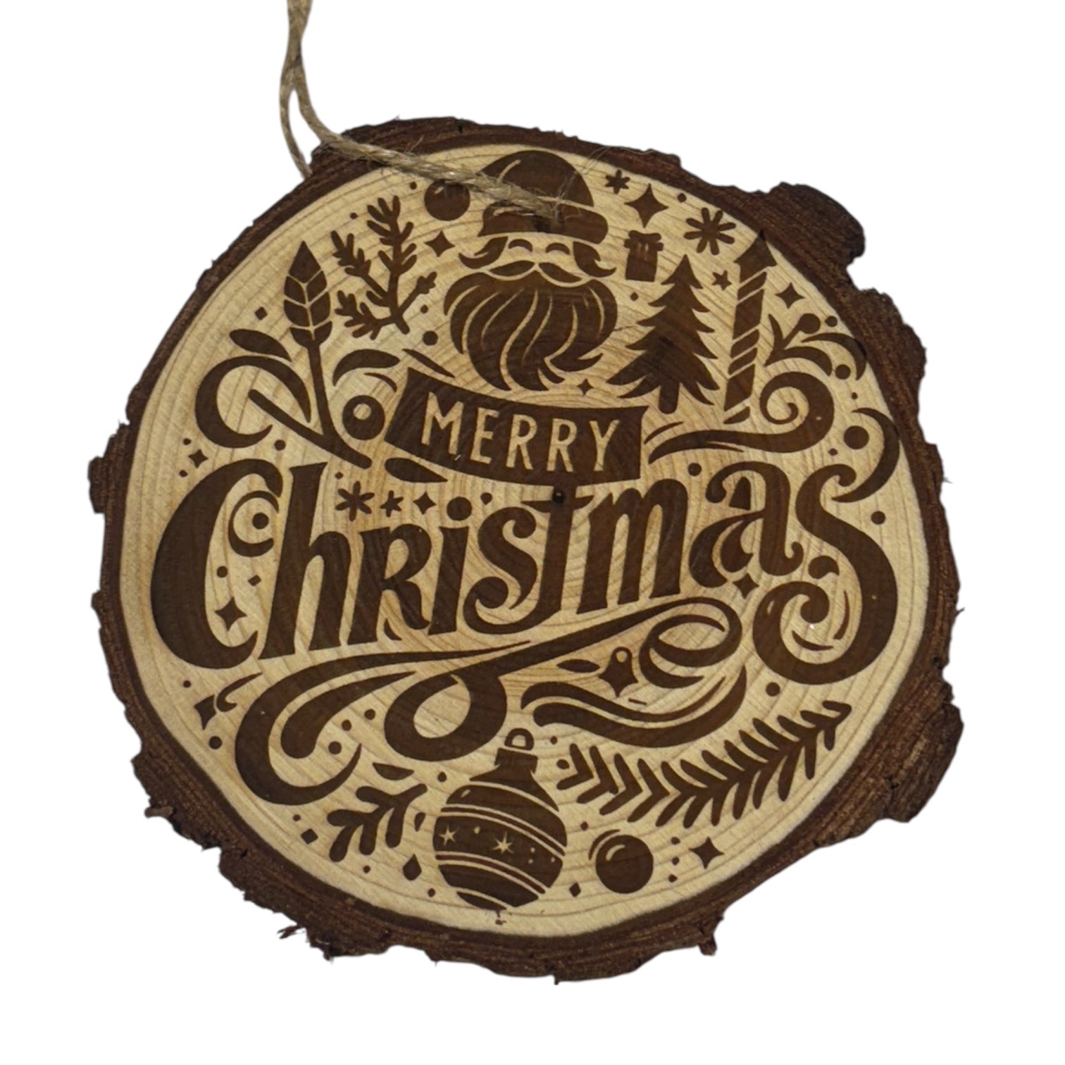 Celebrate the season with a rustic touch! This engraved wood slice ornament features a festive “Merry Christmas” design complete with Santa, trees, and holiday accents. Each ornament is crafted from a natural live-edge wood slice and comes ready to hang with twine.