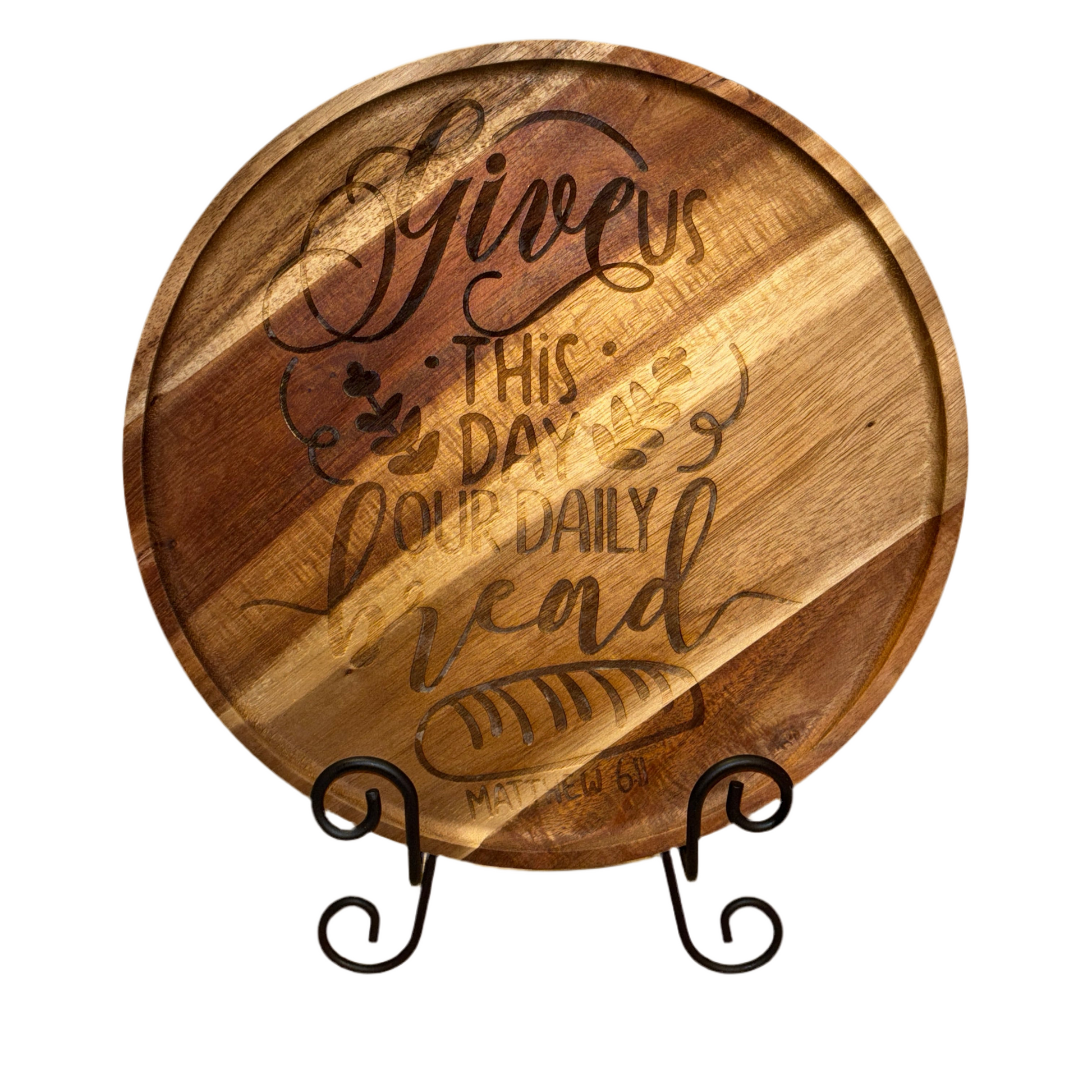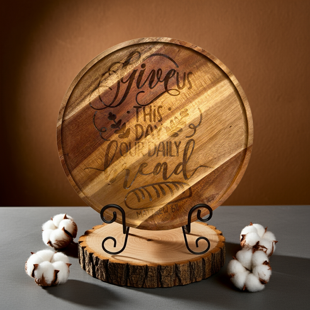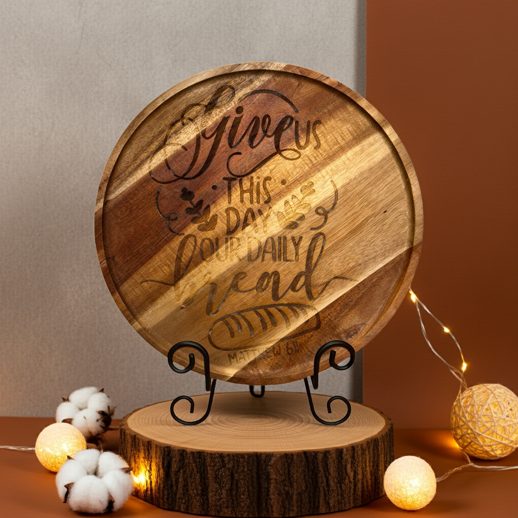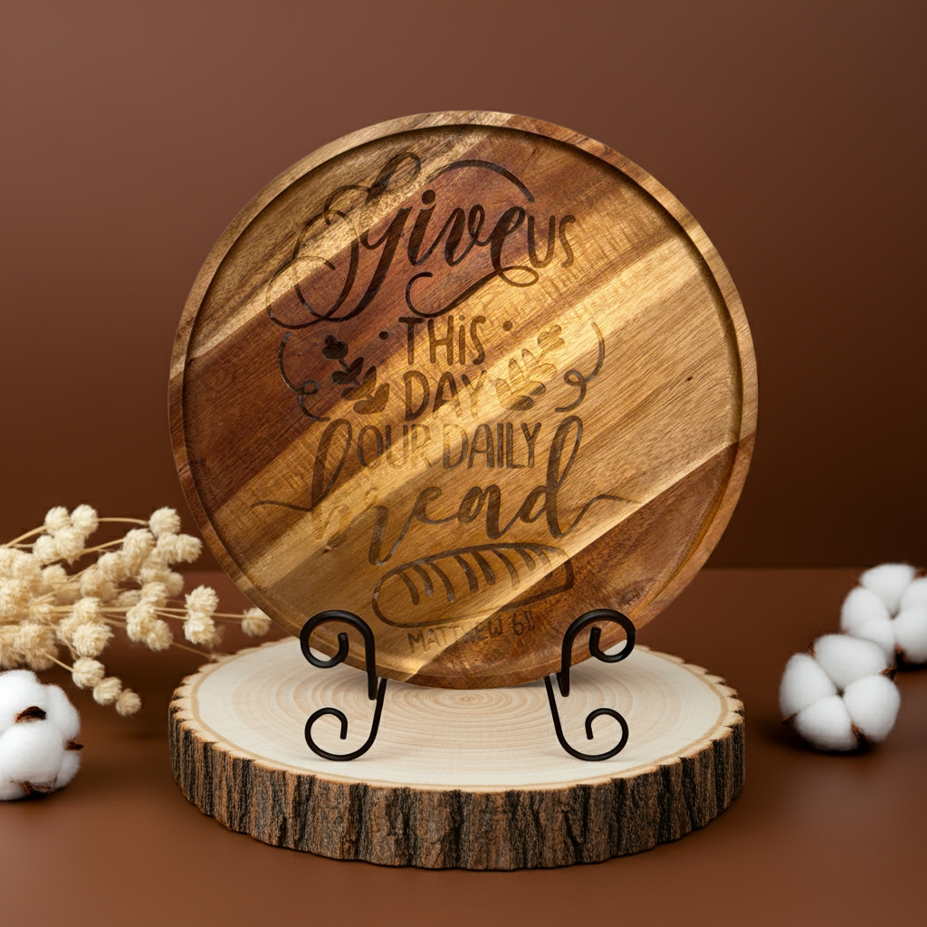 This beautifully engraved round tray brings both warmth and faith to the table. Featuring Matthew 6:11 — “Give us this day our daily bread” — it’s perfect for serving, displaying, or gifting to someone who finds comfort in faith, family, and food.