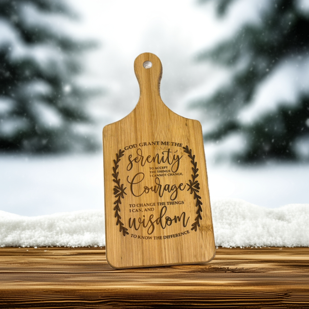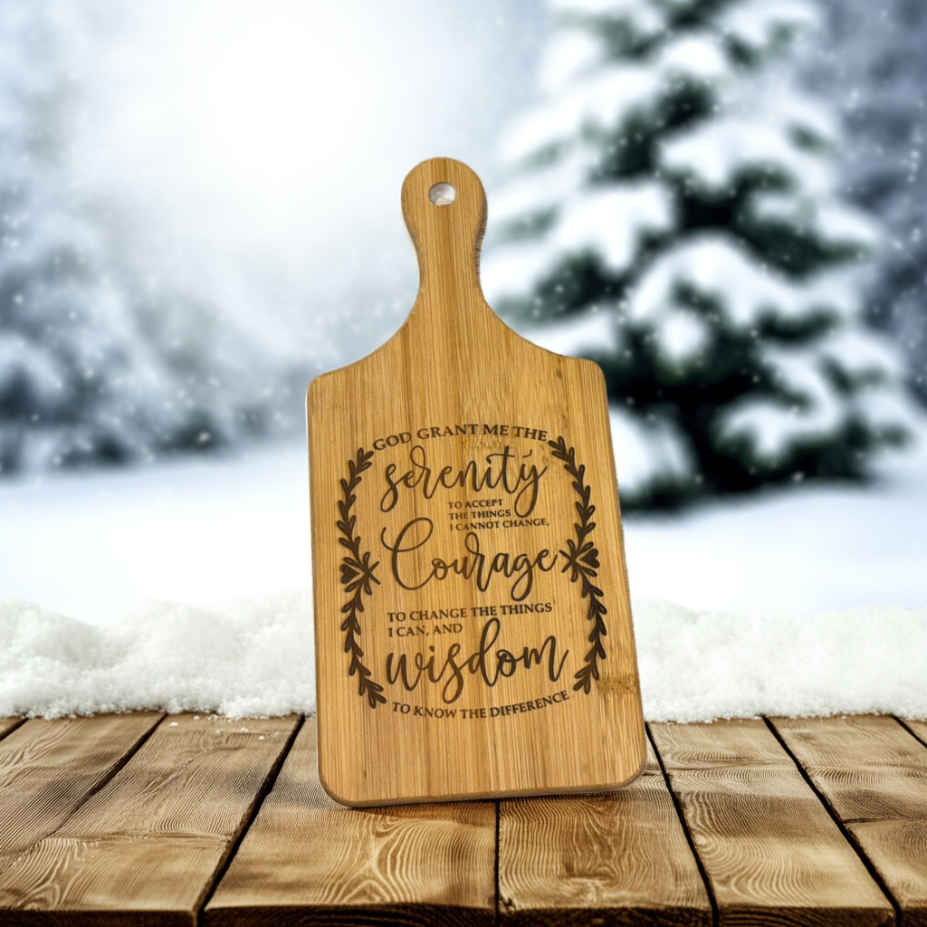 A meaningful reminder for any kitchen or gathering space, this engraved Serenity Prayer cutting board blends spiritual comfort with handcrafted design. The mini bamboo paddle board features the full Serenity Prayer engraved in an elegant script framed by a leafy floral wreath.