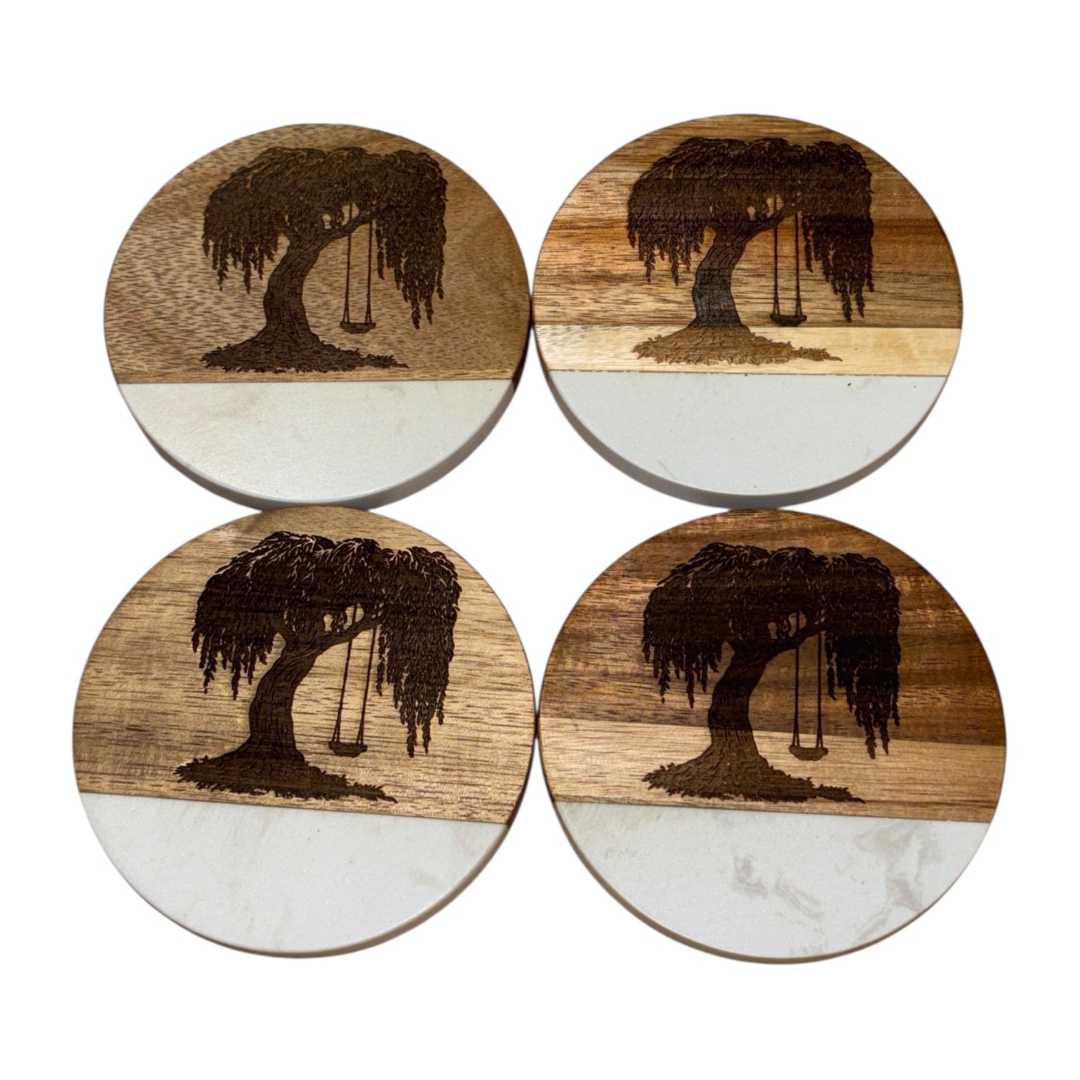 Engraved Willow Tree Coaster Set – Marble & Acacia Wood (Set of 4)