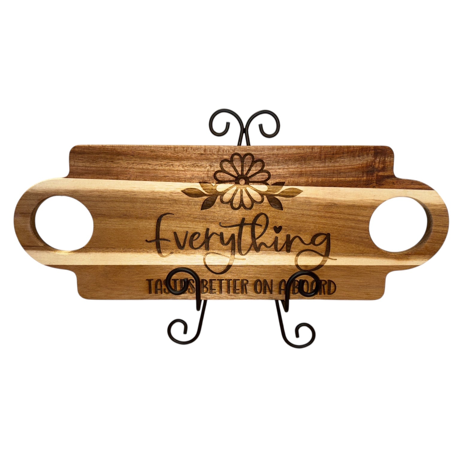Laser-engraved with “Everything tastes better on a board” and floral accent