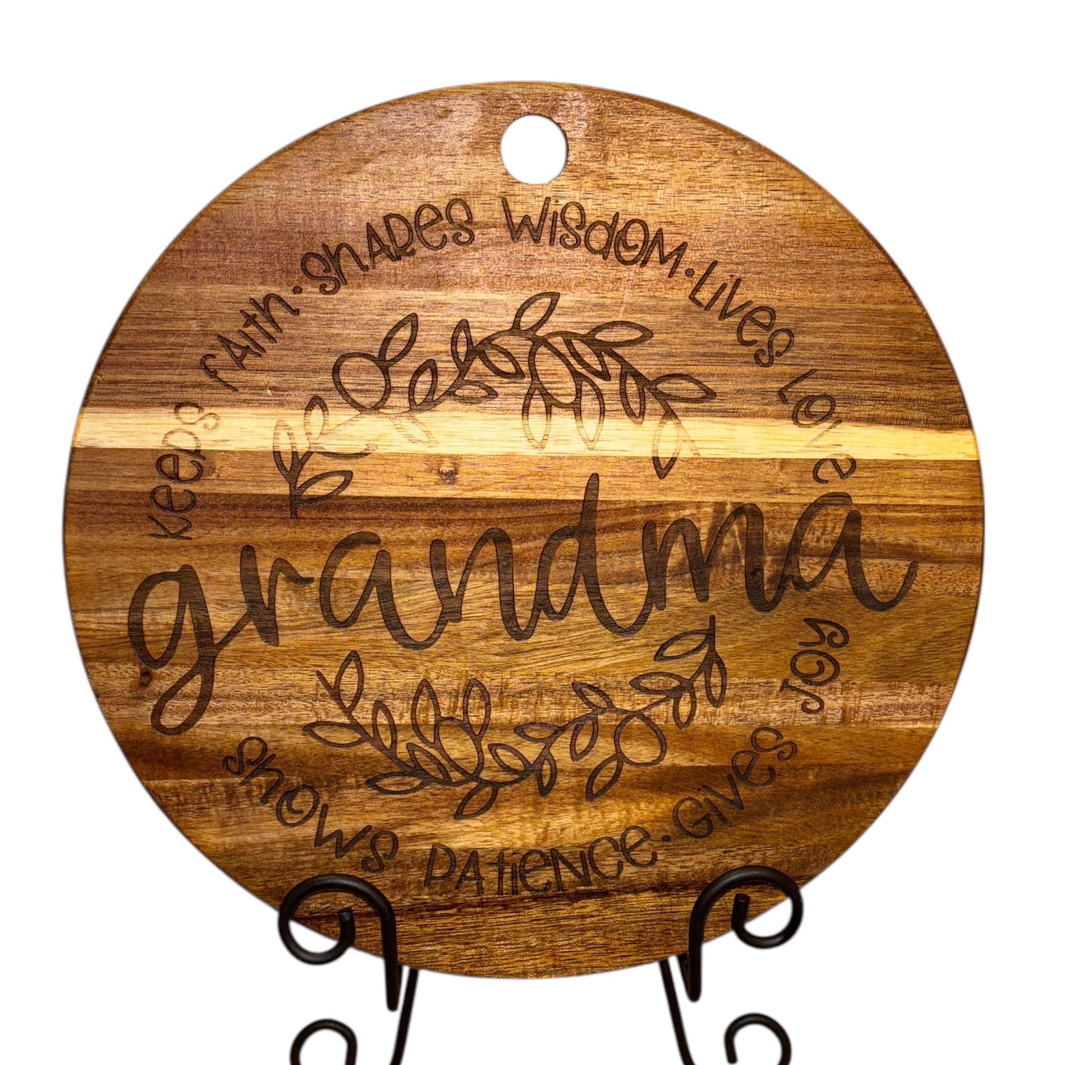 “Grandma” Engraved Wooden Cutting Board – 12” Round Acacia | Faith, Love & Joy Gift Sign
