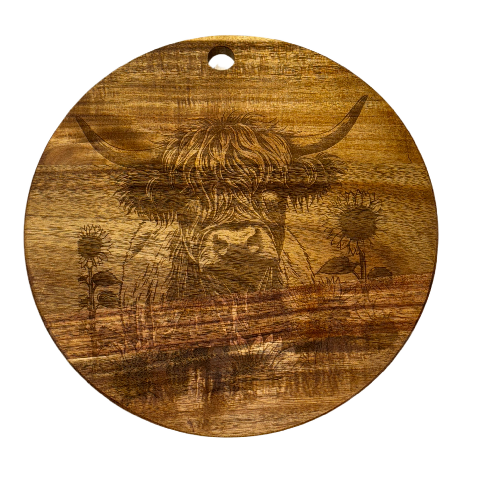 Bring the charm of the countryside into your kitchen with this beautifully engraved Highland cow board. At 12” round, it’s large enough to stand out, yet versatile enough to display, gift, or use as a functional accent.