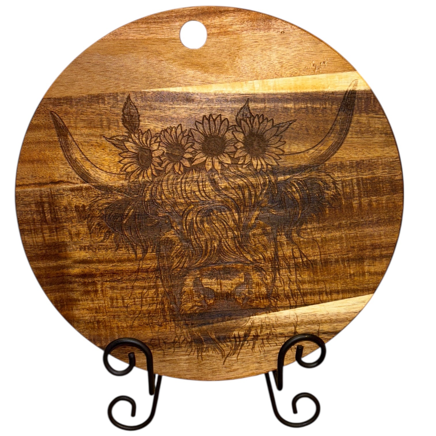 Highland Cow with Flower Crown – Engraved Acacia Wood Cutting Board | 12” Round Rustic Farmhouse Decor