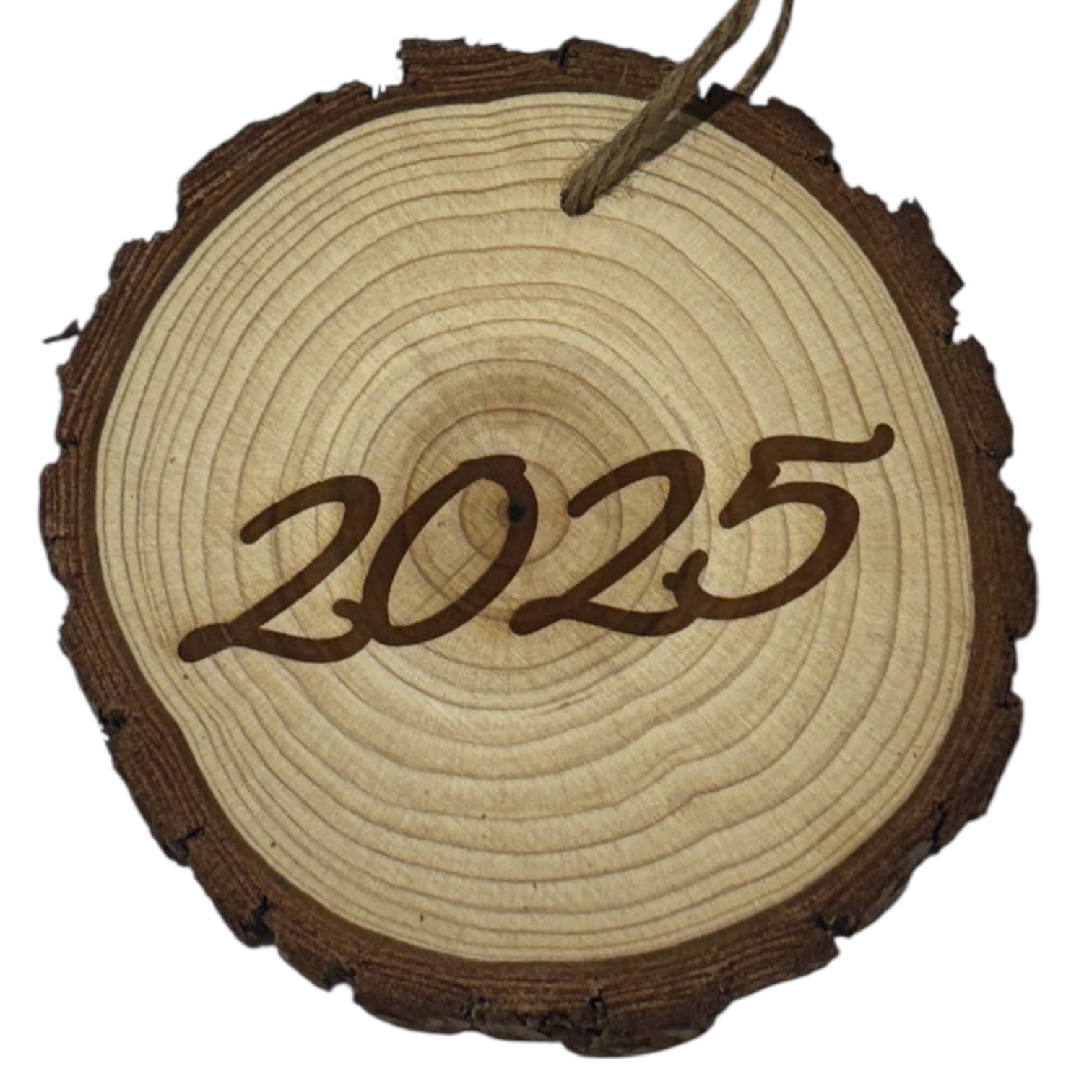Each ornament is made from a natural 3–4” live edge wood slice, giving every piece a unique look with its own wood grain, shape, and coloring. The back includes the year engraving, along with space for multi-word customization to add names, phrases, or a holiday message.