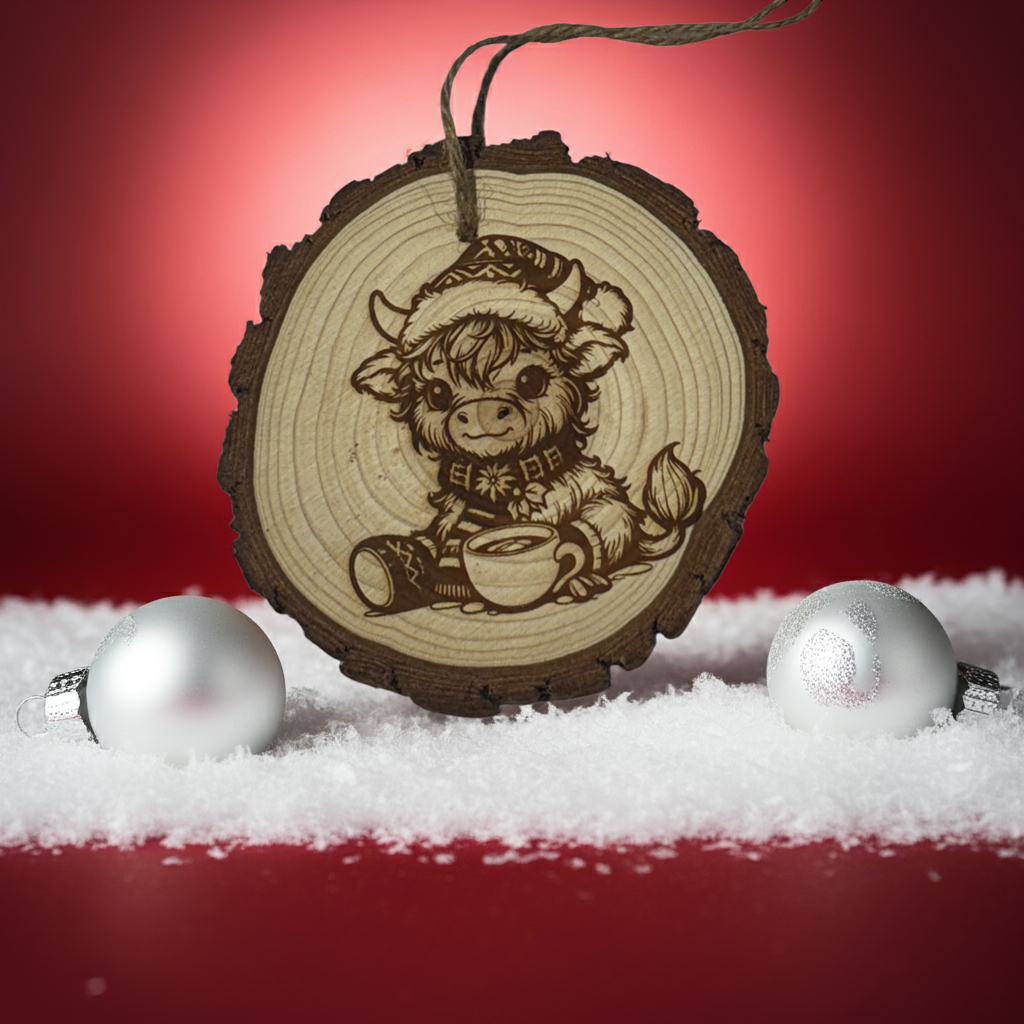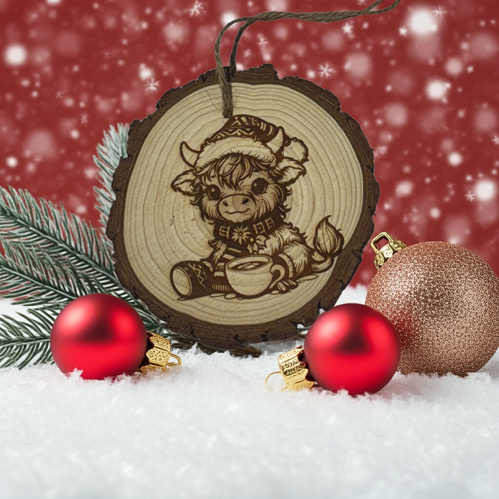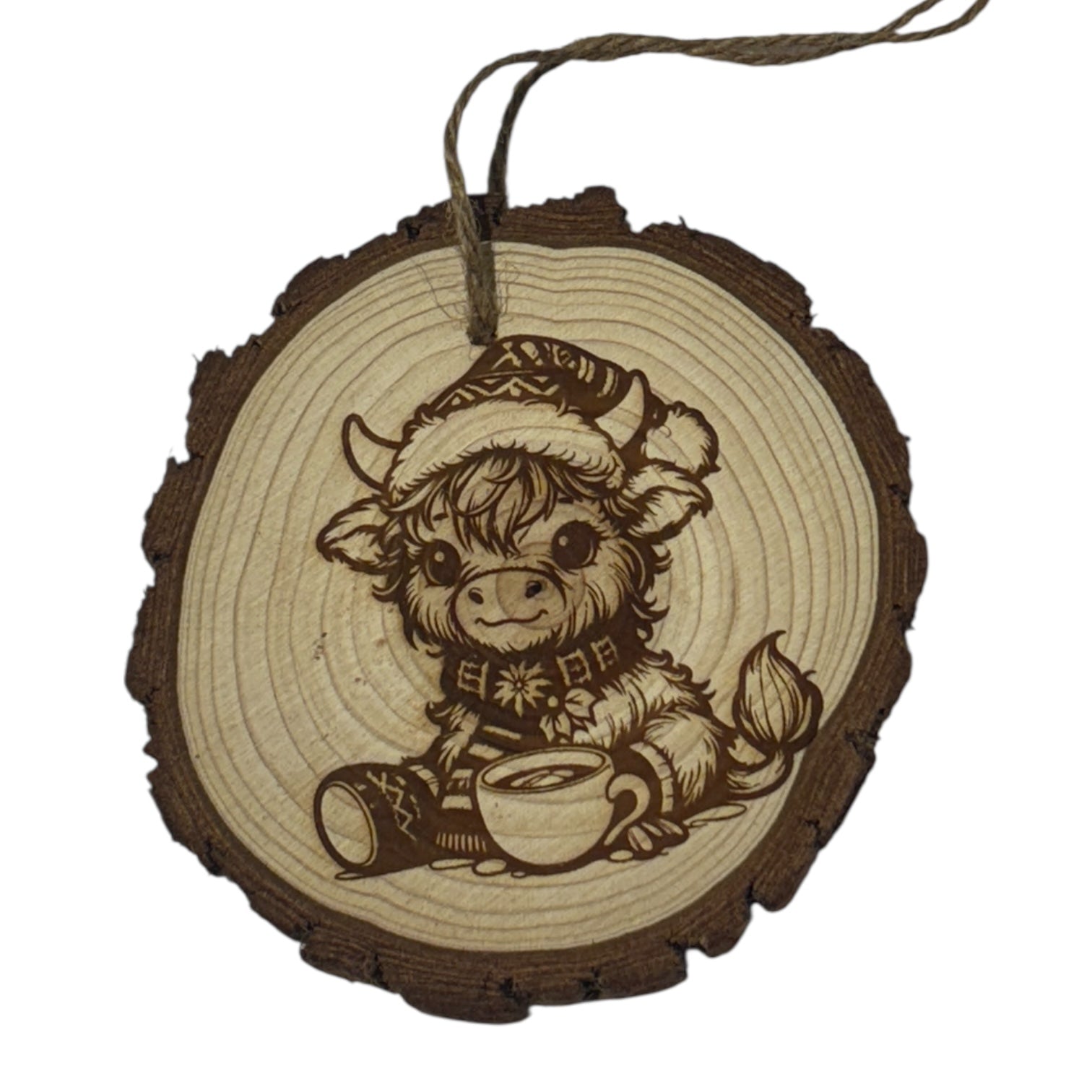 Limited Edition Highland Cow with Cocoa Christmas Ornament – Engraved Rustic Wood Slice (3–4”)