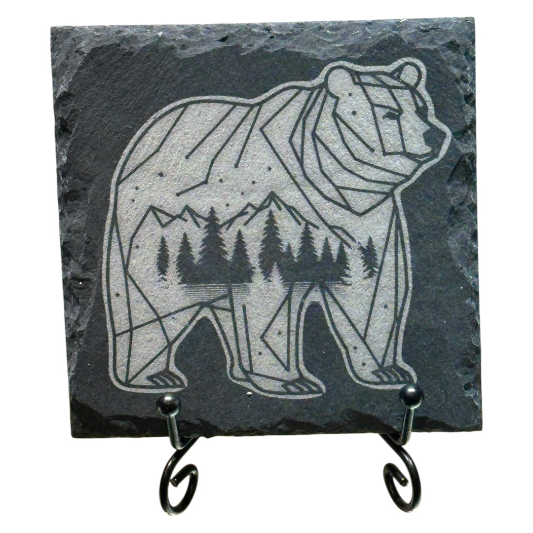 Bring bold, modern nature vibes to your space with this mini engraved slate tile featuring a geometric bear filled with a detailed pine forest and mountain scene. The design blends sharp lines with wild serenity, making it perfect for nature lovers, minimalist decorators, and anyone who vibes with the wild.
