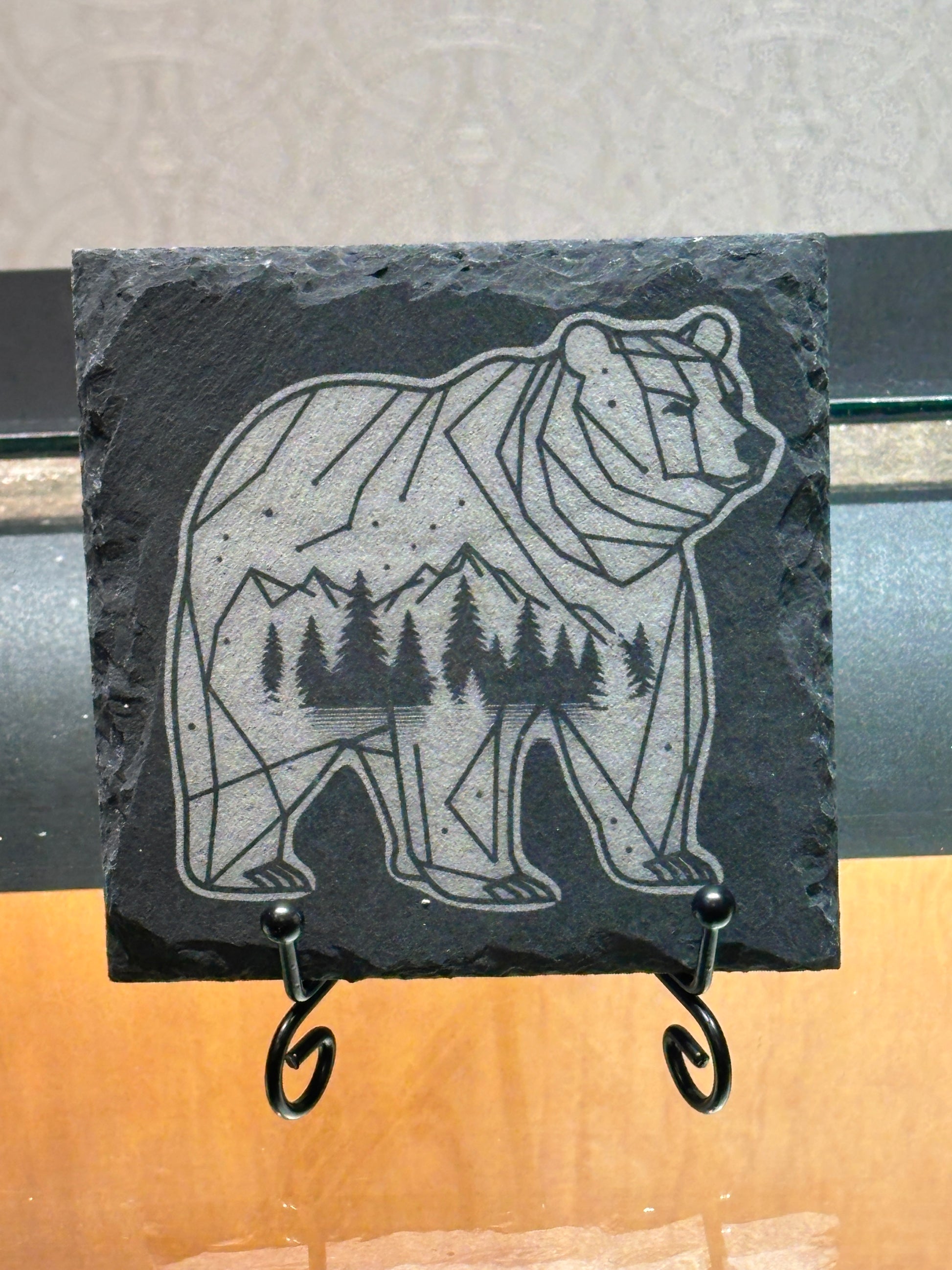 Mini Engraved 4” Slate – Geometric Bear with Forest Landscape