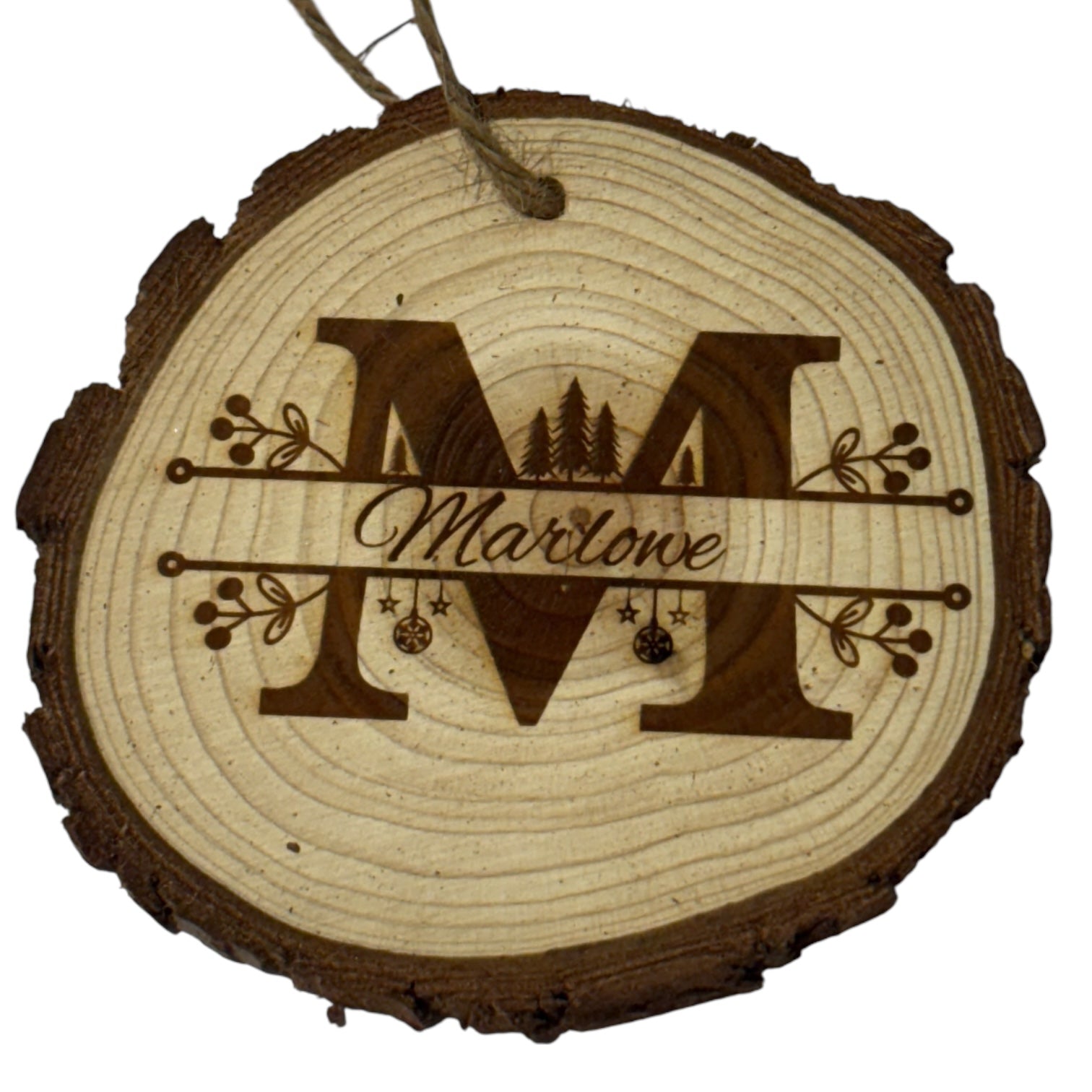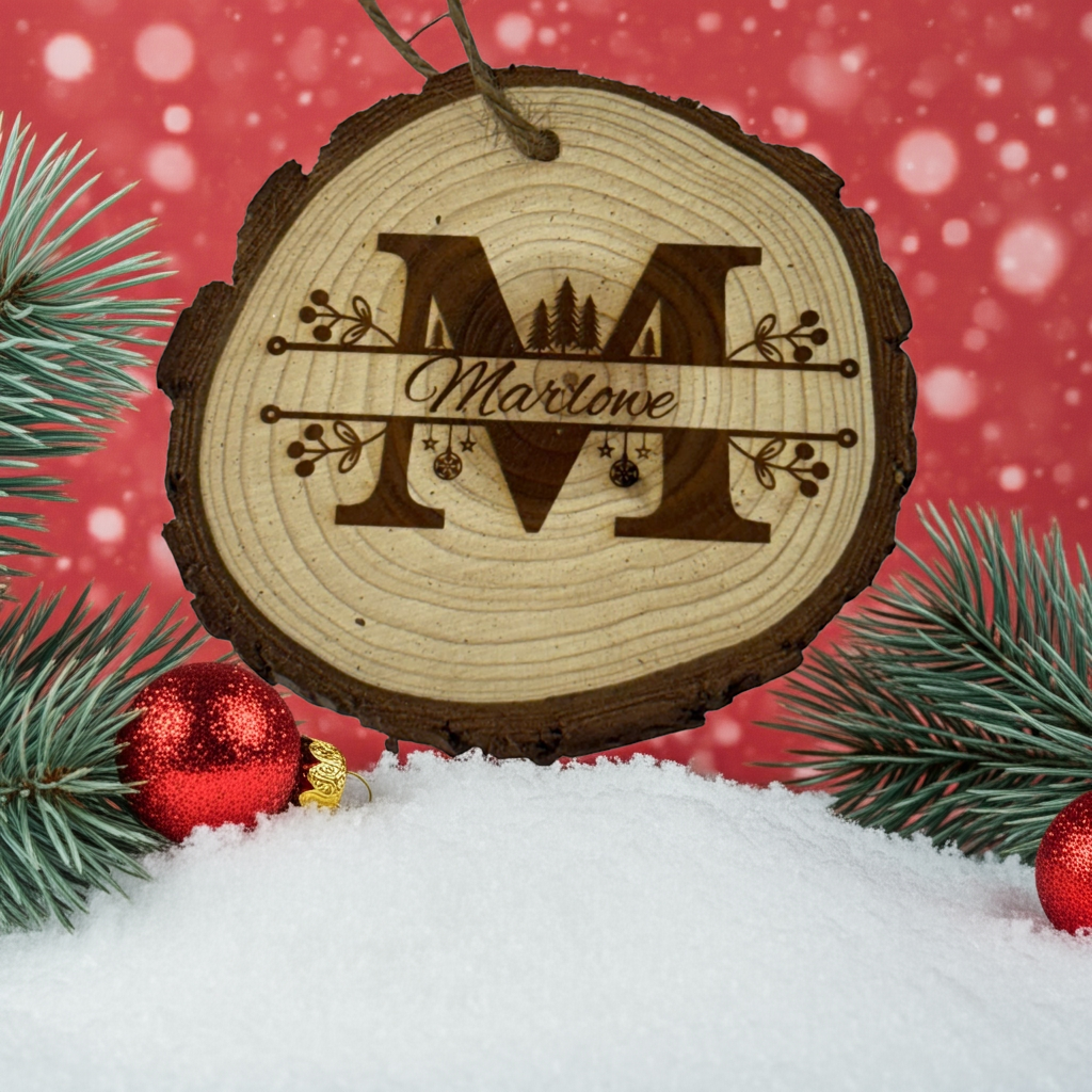 Celebrate your family name with this personalized wood slice ornament, engraved with your last name and bold holiday monogram on the front — plus the year already engraved on the back for an instant keepsake. This rustic-style ornament features a natural wood slice with bark edge, festive pine trees, ornaments, and berry sprigs, all tied together with your custom name.