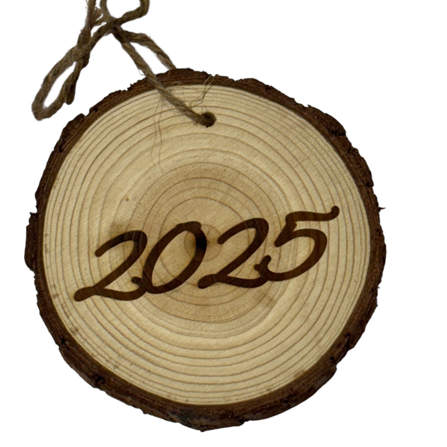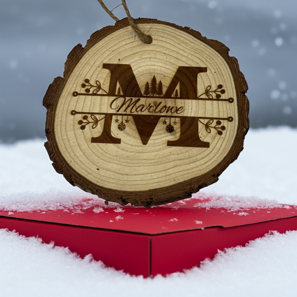 Personalized Last Name Ornament – Rustic Wood Slice with Year Engraving (One Word Custom Front Only)