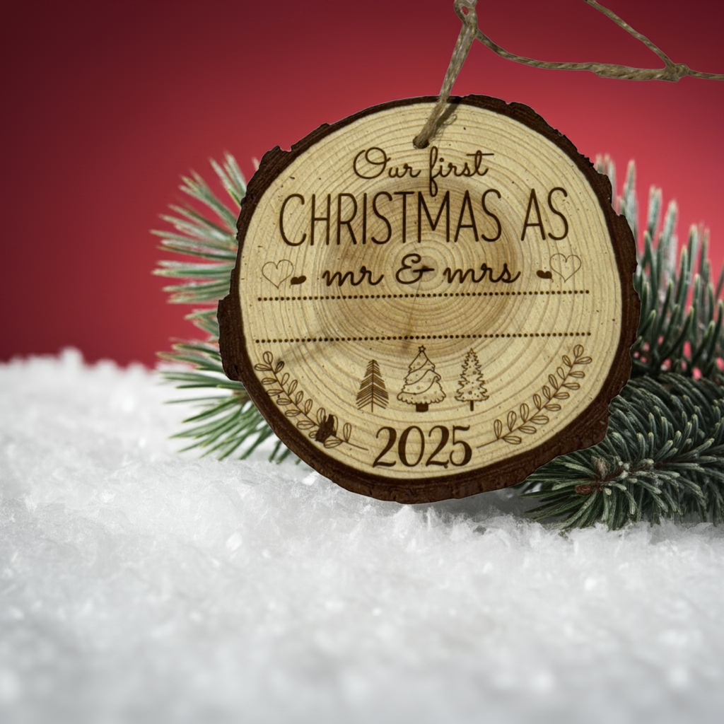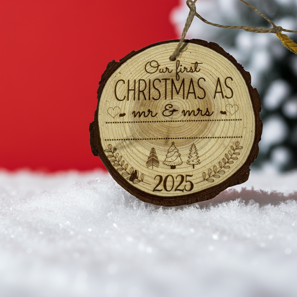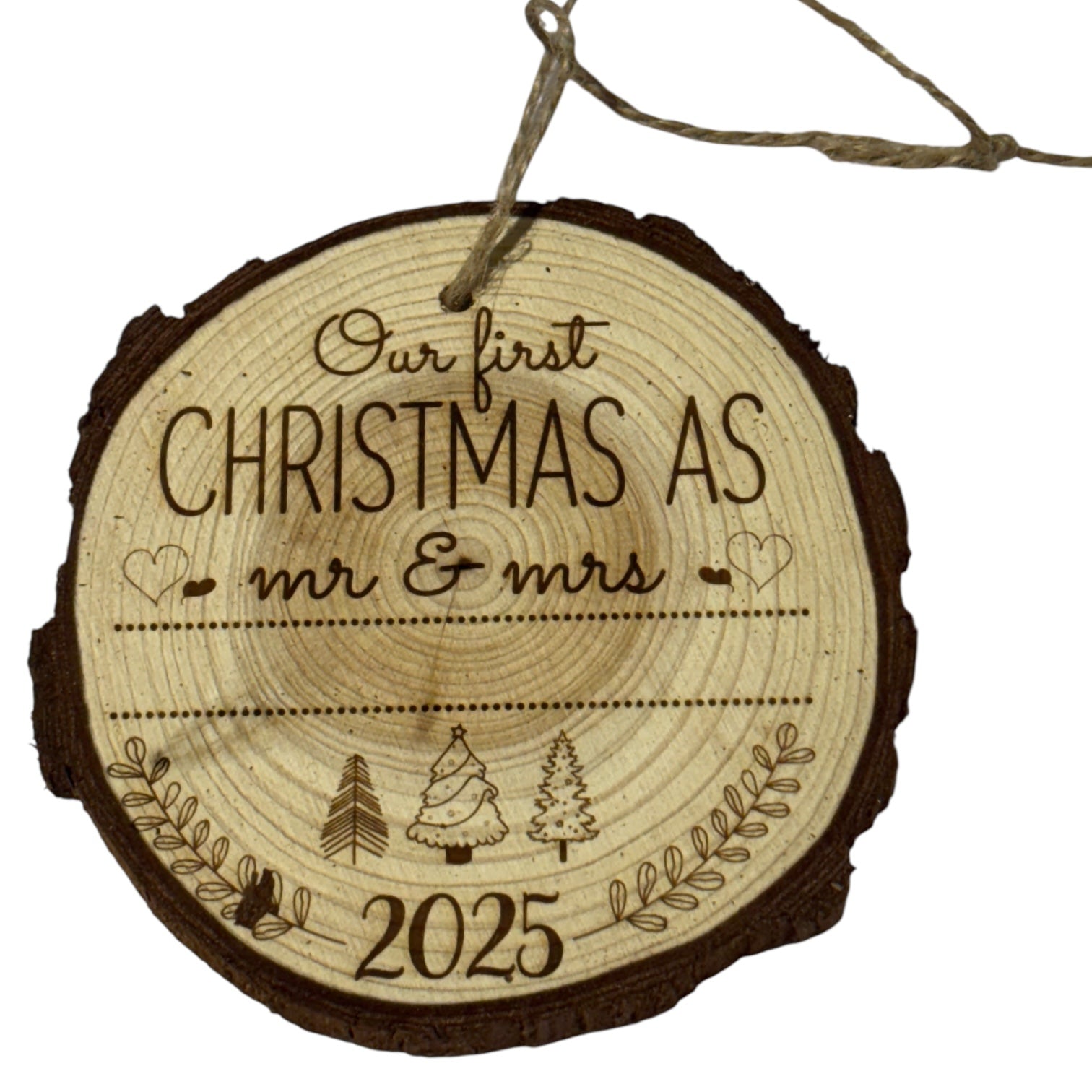 Our First Christmas as Mr & Mrs Ornament 2025 – Personalized Engraved Wood Slice (Rustic 3–4”)