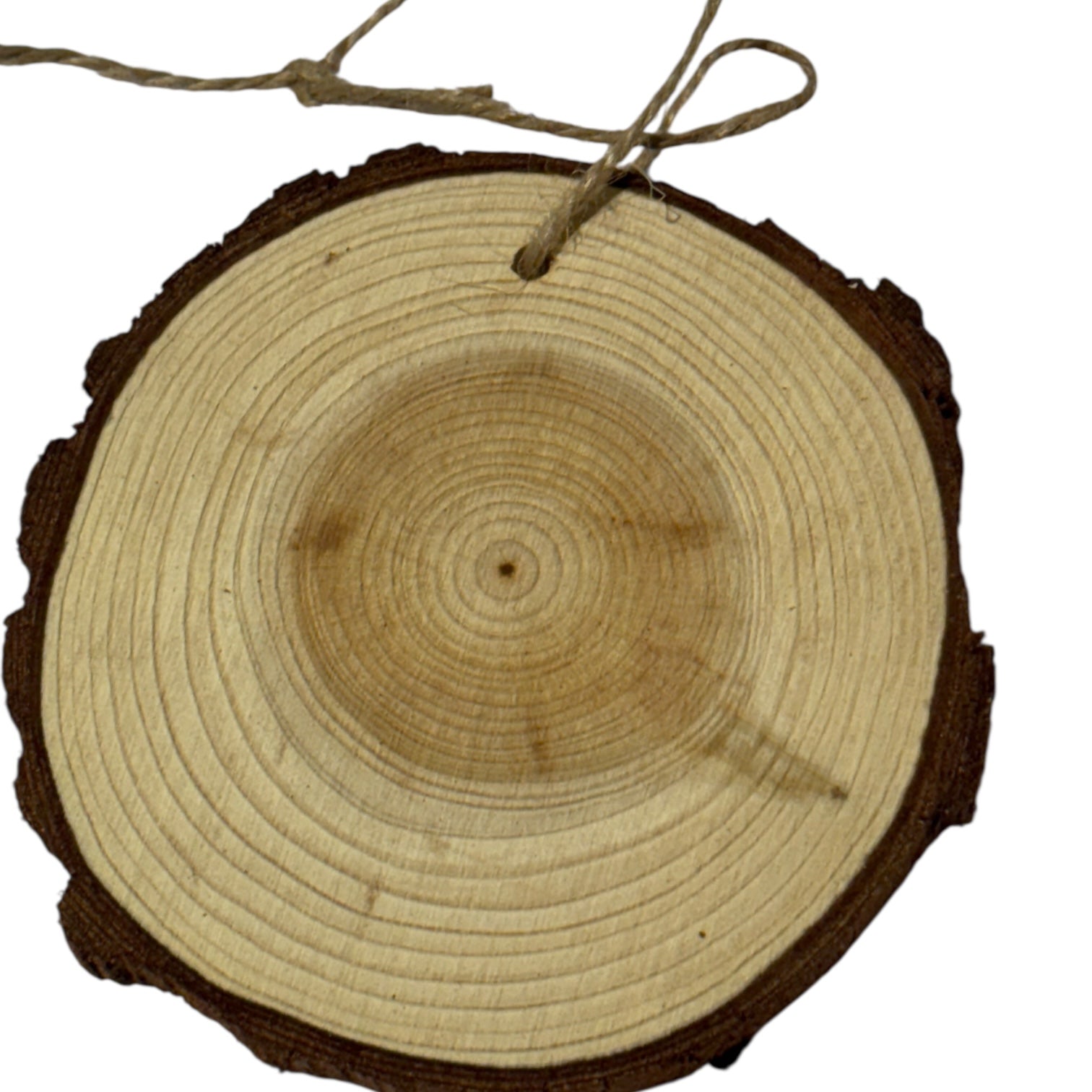 Each piece is made from a natural 3–4” live edge wood slice, ensuring no two ornaments are exactly alike. Grain, shape, and coloring vary, giving every ornament its own rustic charm.