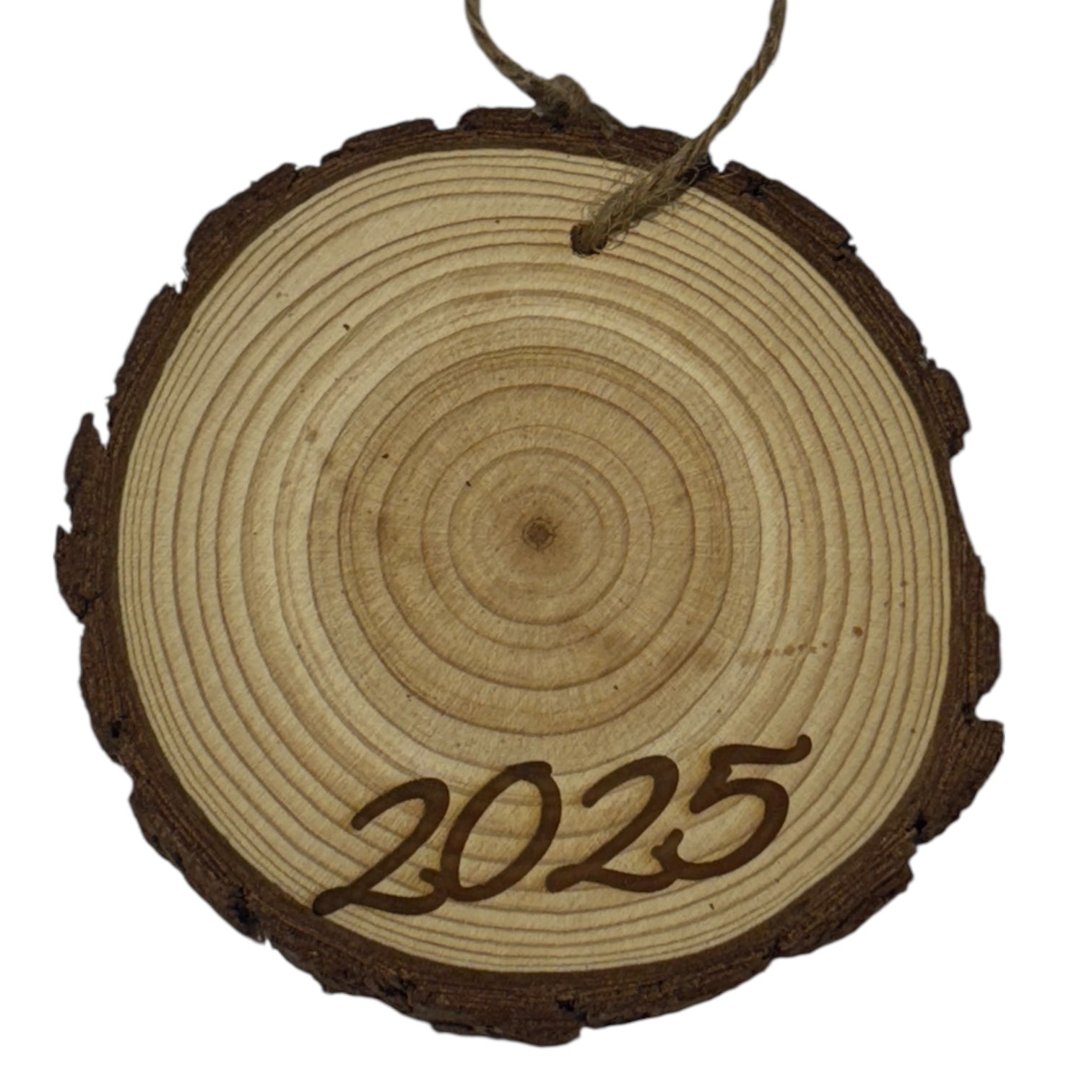 Crafted from natural 3–4” live edge wood slices, each ornament is unique with its own grain, shape, and coloring. The front is laser-engraved in detail, while the back includes the year and space for multi-word personalization — add names, a special message, or a short phrase to make it one-of-a-kind.