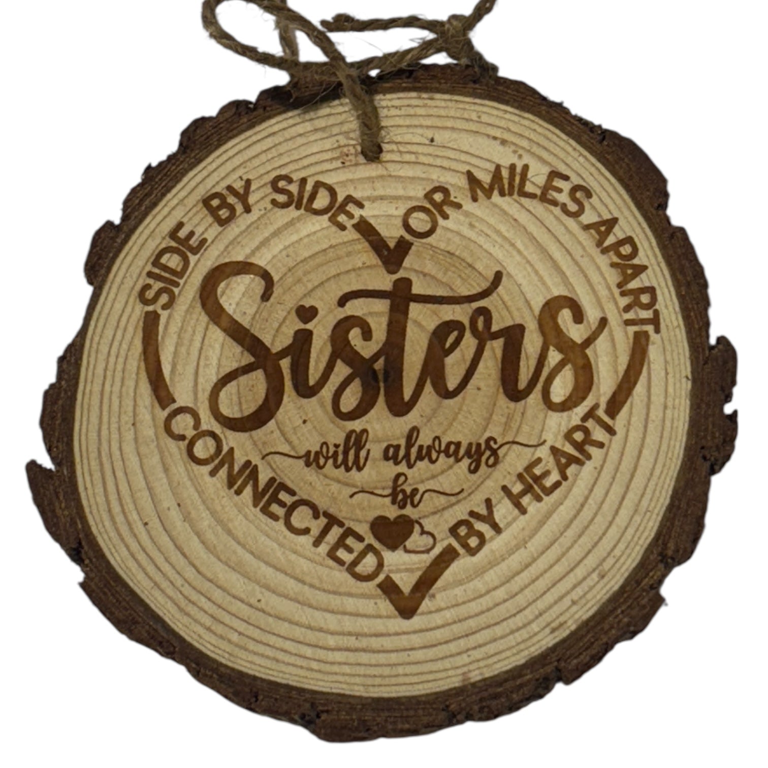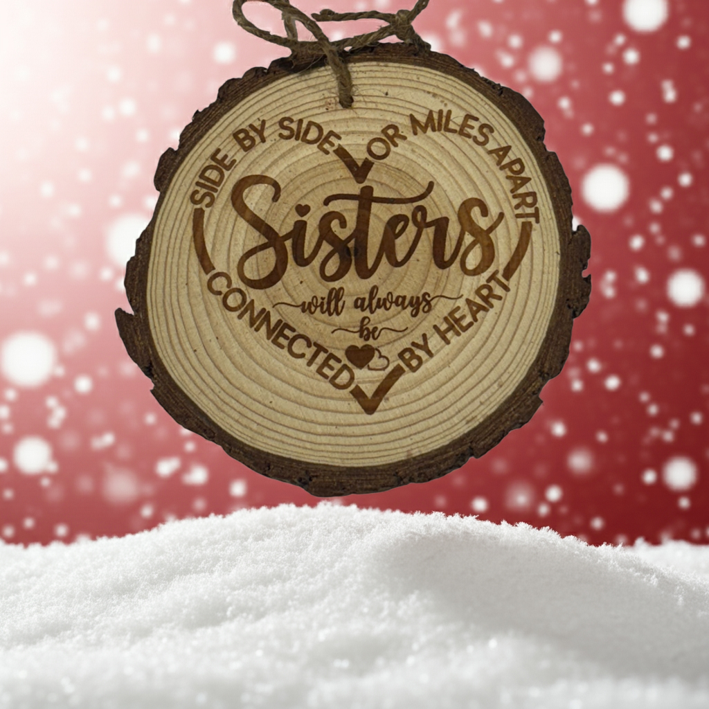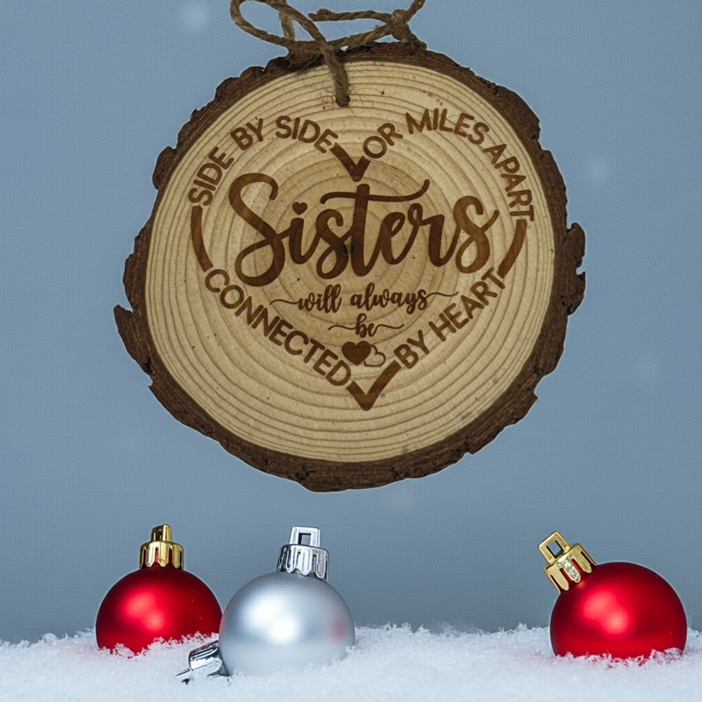Personalized Sisters Christmas Ornament – Engraved Wood Slice Keepsake (Rustic Live Edge 3–4”)