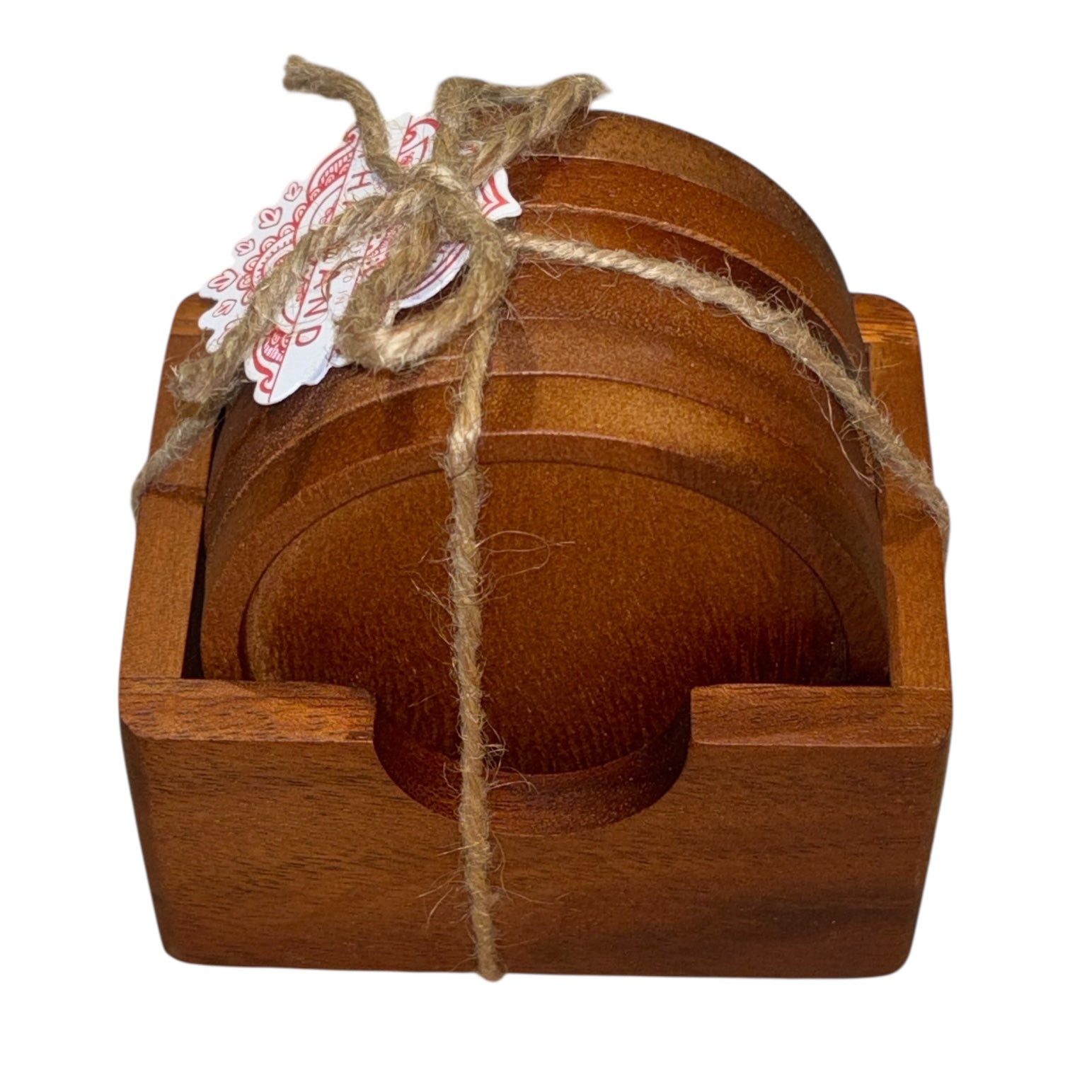 Classic, clean, and easy to gift. This set of 6 round wooden coasters comes bundled in a matching wooden holder and tied with rustic twine. A warm wood tone makes them perfect for any kitchen, coffee table, or office.