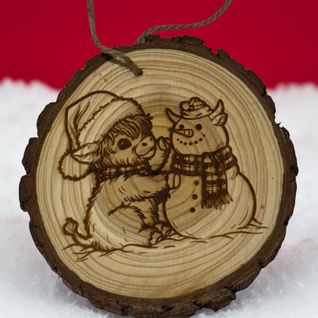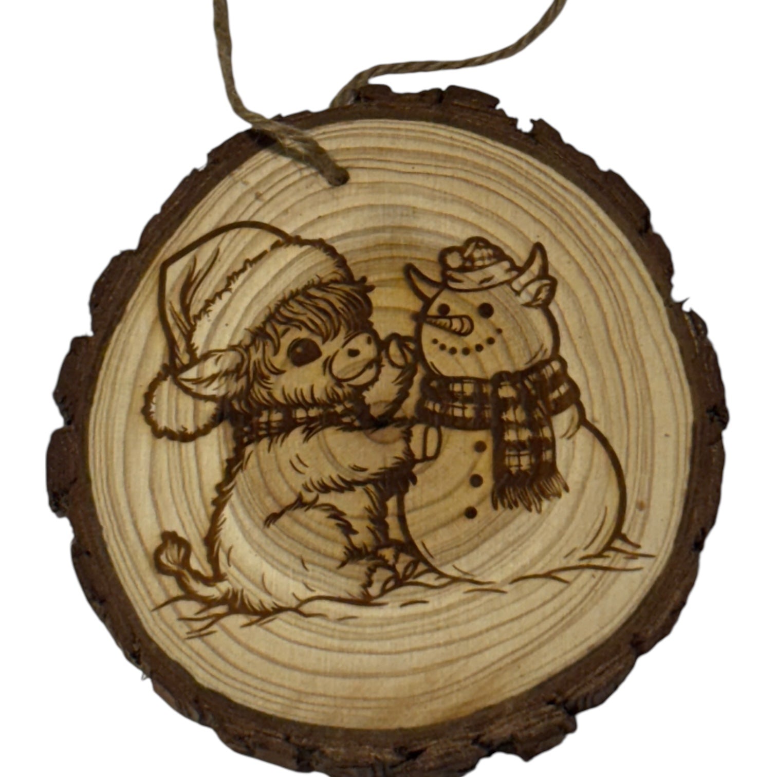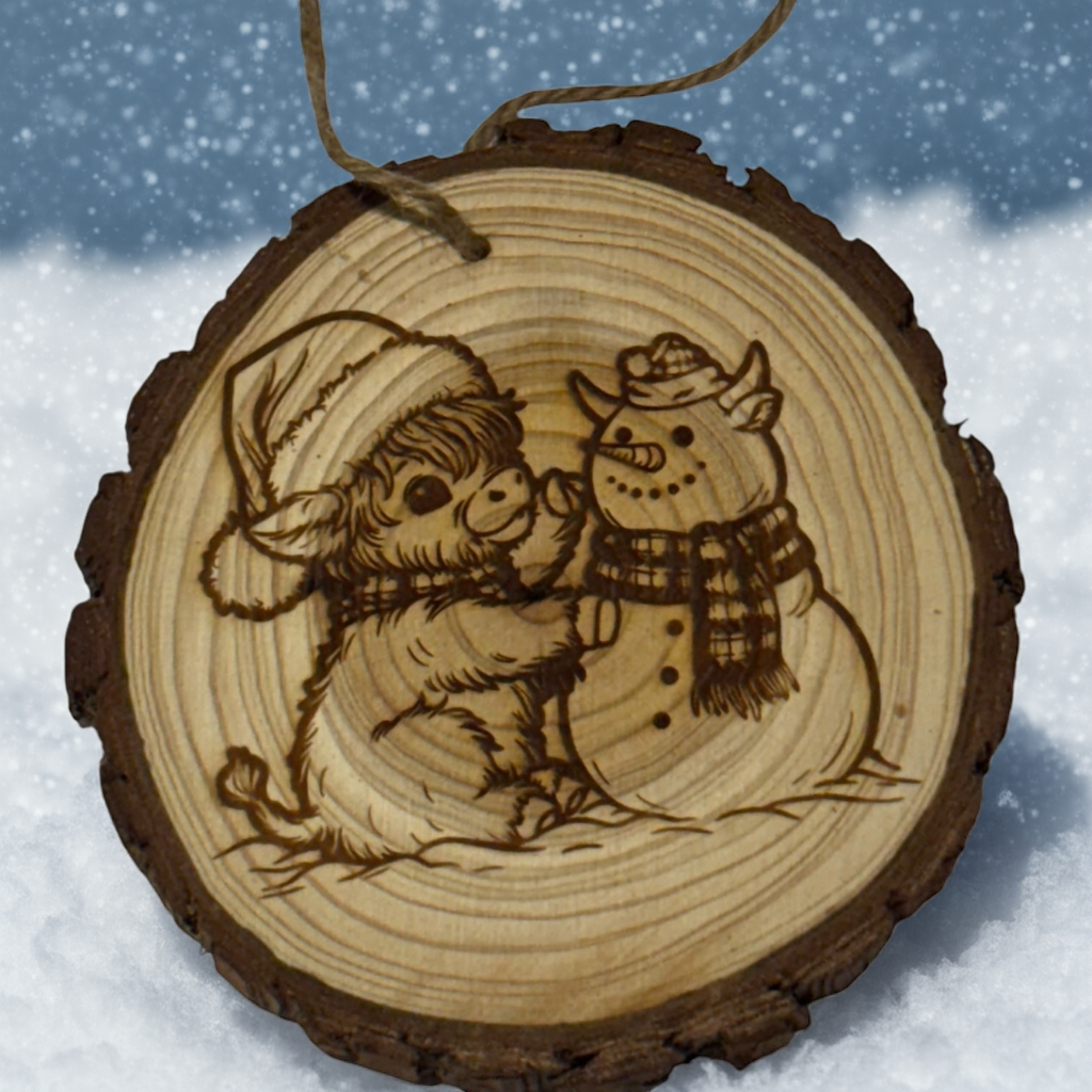Highland Cow & Snowman Christmas Ornament – Laser Engraved Wood Slice – Limited Edition Farmhouse Decor