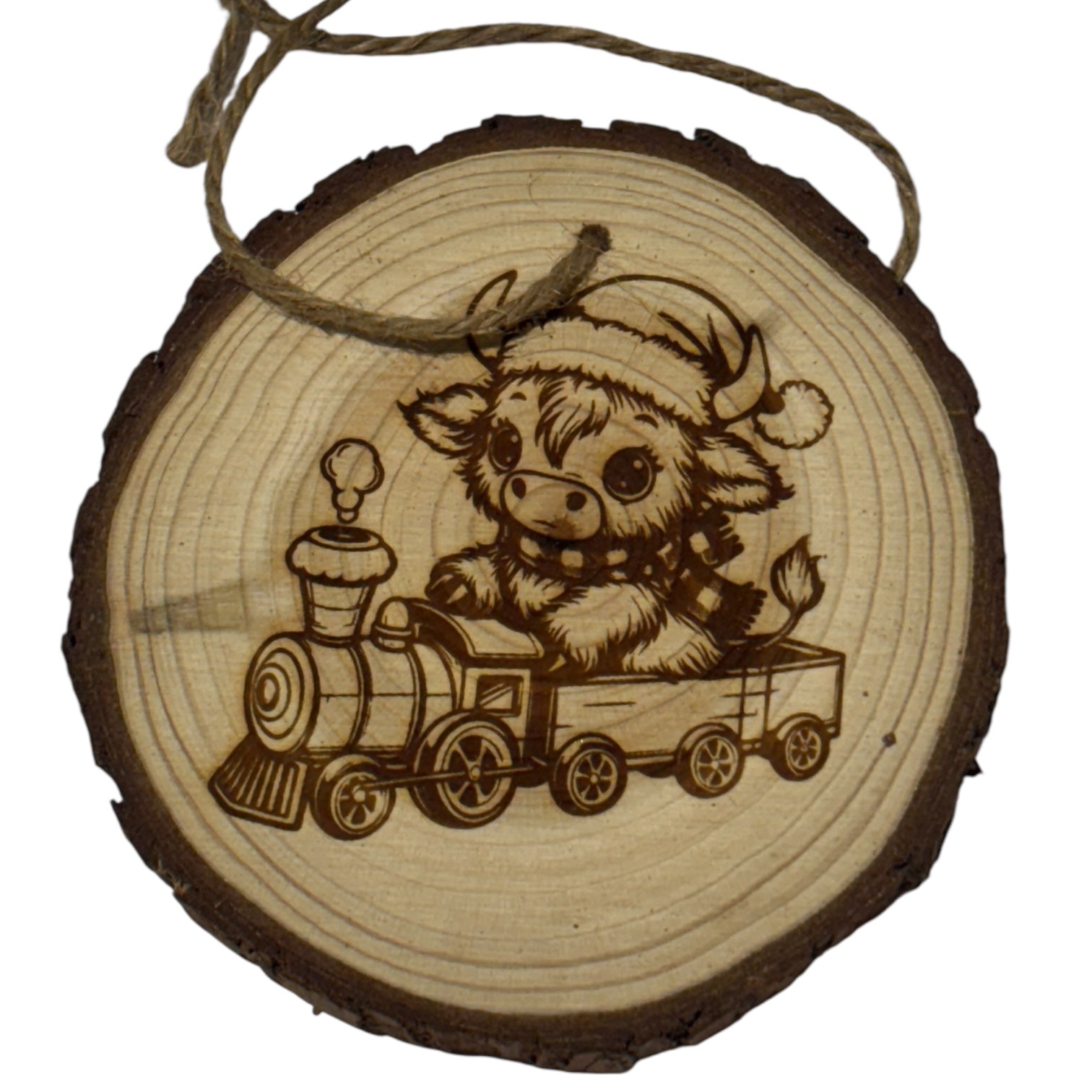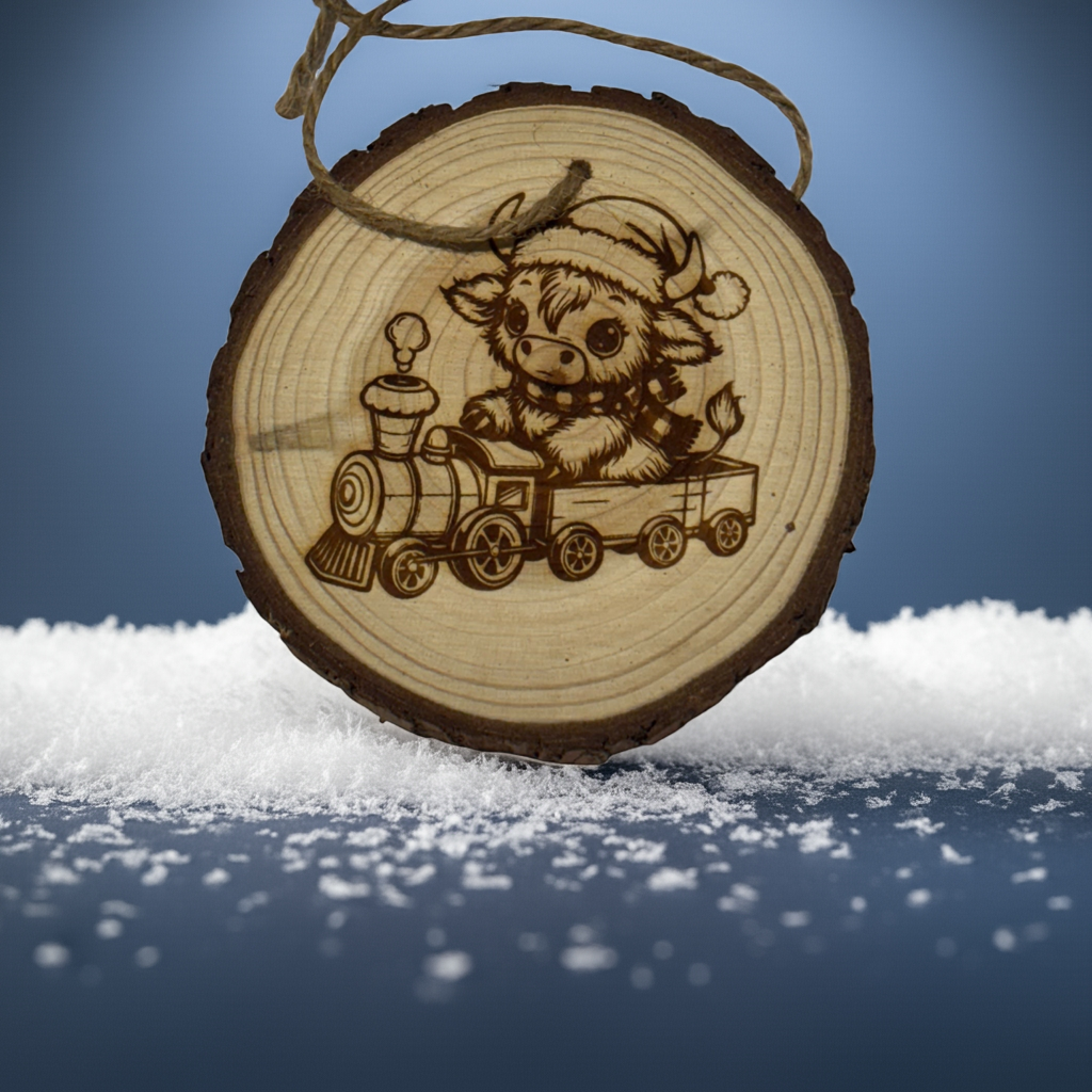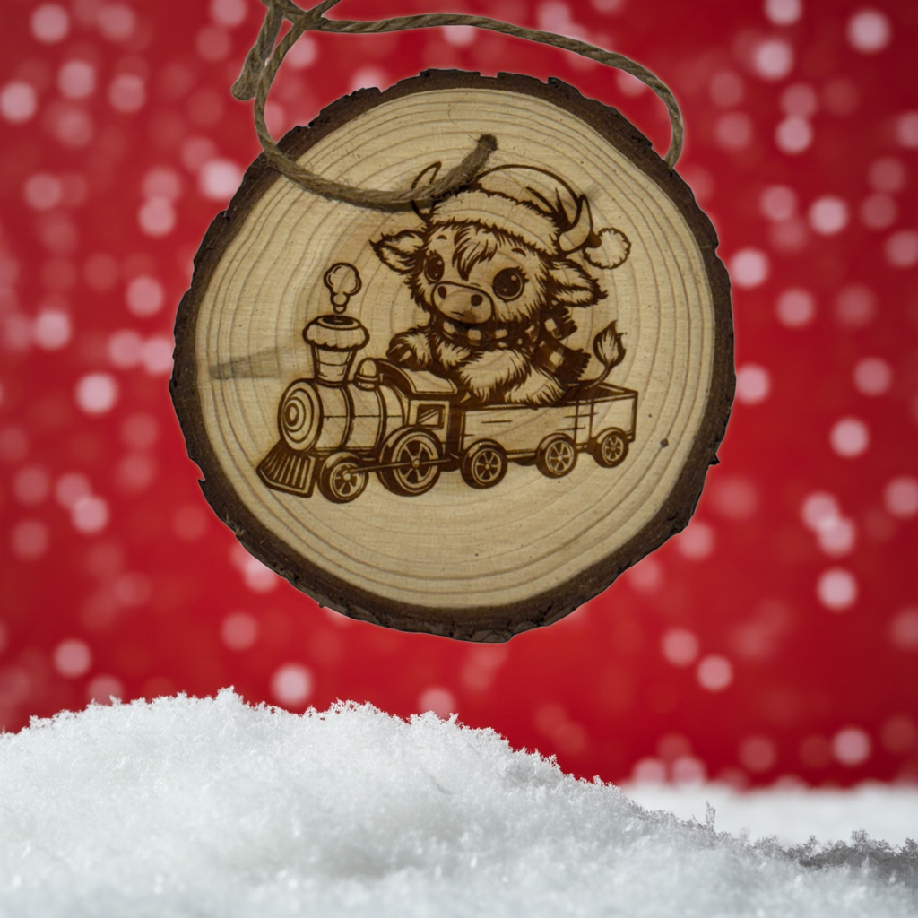 Highland Cow Train Christmas Ornament – Engraved Rustic Wood Slice with Year & Custom Back (3–4”)